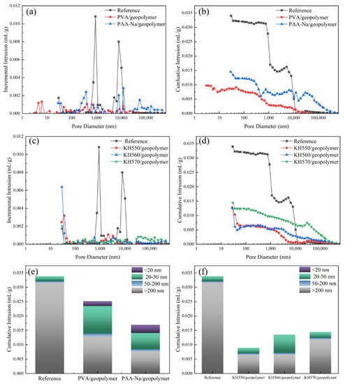 The porosity and pore size distribution of organic–inorganic composite geopolymer paste were shown in Figure 7a–d. The pore volume distribution of paste is shown in Figure 7e,f. The pore diameter is divided into four categories []: harmless pores (d < 20 nm), little harmful pores (d = 20–50 nm), harmful pores (d = 50–200 nm), and much harmful pores (d > 200 nm). As shown in Figure 7a,c, the organic–inorganic composite geopolymer pastes have lower capillary porosity in comparison to the reference paste. The cumulative pore size distributions are given in Figure 8b,d. It is seen that the cumulative pore volume of the reference is about 0.035 mL/g. The total pore volume of the incorporation of chemical reactive polymers is nearly 0.015 mL/g and 42.86% of the reference. As shown in Figure 7e,f, the total pore volume of PVA/geopolymer, PAA-Na/geopolymer, KH550/geopolymer, KH560/geopolymer and KH570/geopolymer are 28.58%, 42.85%, 99.99%, 38.58% and 42.38% of the reference. The proportion of harmful pores volume larger than 50 nm of PVA, PAA-Na, KH550, KH560 and KH570 are 40.58%, 24.28%, 99.8%, 20.58% and 38.33% of the reference. The same conclusion can be drawn from Figure 7b,d. The addition of chemically reactive polymers can reduce the overall pore size and total porosity of the geopolymer matrix due to the formation of an organic–inorganic cross-linking network structure.