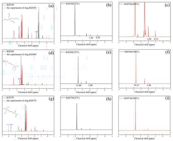 The polymerization degree between different functional groups of polymers and hydration products of geopolymer was investigated by the liquid-state 1H NMR experiment [], and the results are shown in Figure 8 and Figure 9. The mechanical, physical and chemical adsorption content of SCAs in C-A-S-H gel of slag geopolymer is shown in Figure 8a,d,g, where the black spectrum represents pure SCAs, and the red spectrum represents the supernatant of KH550/slag geopolymer solution, KH560/slag geopolymer solution and KH570/slag geopolymer solution. Resonance at the chemical shift of about 1.38 ppm represents CH2-CH2-CH2 of KH550. Resonance at approximately 3.64 ppm is attributed to CH2-CH2-CH2 of KH560, and resonance at 6.03 ppm and 5.67 ppm stands for CH2=C(CH3)COOR of KH570. According to Figure 8a,d,g, all red spectra do not show characteristic peaks of SCA, indicating the supernatant-free SCAs were all absorbed in the hydration products.