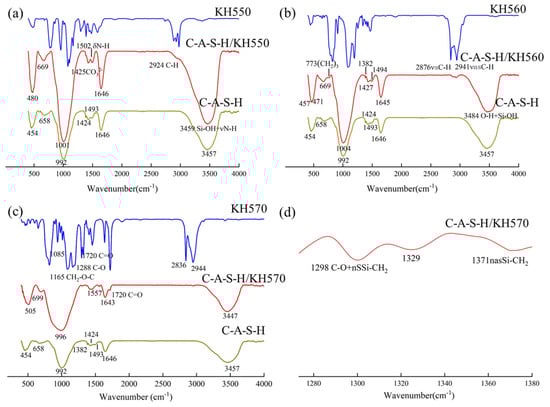 FTIR spectra of (a) C-A-S-H/KH550; (b) C-A-S-H/KH560; (c) C-A-S-H/KH570; (d) C-A-S-H/KH570 (Local amplification spectrum).