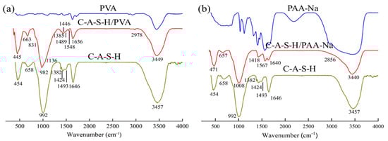 FTIR spectra of (a) C-A-S-H/PVA; (b) C-A-S-H/PAA-Na.