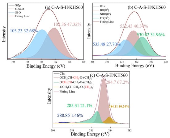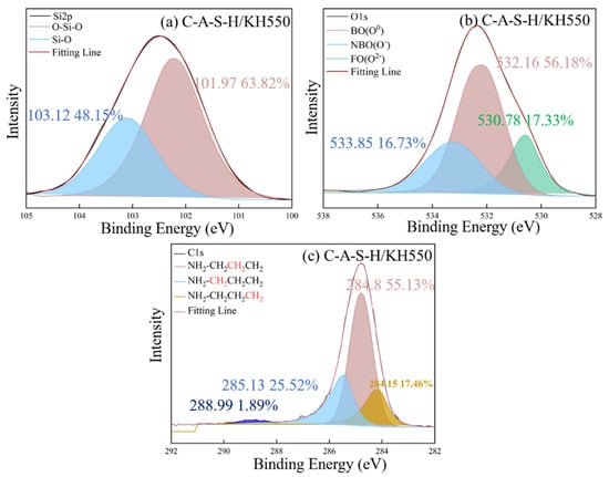 As shown in Figure 15c, the existence of KH570 is proved by the characteristic peaks of CH2=C(COO−)CH3 at 285.12 eV and COO− at 286.08 eV. In addition, the KH550 and KH560 have the characteristic peak of NH2-CH2− at 285.13 eV and the epoxy group at 285.31 eV in Figure 13c and Figure 14c, respectively. The detected characteristic chemical environment of C1s is in line with the testing results of FTIR.