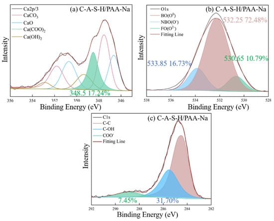 The interaction between PAA-Na and hydration products of geopolymer was explained by the acetate and the inorganic ions produced, which are confirmed in the Ca 2p spectrum with the component (Ca(COO)2) at 348.5 eV, compared in Figure 17a,c []. In addition, in the C1s spectrum in Figure 17c, the precipitation of COO- at approximately 288.8 eV indicates the formation of Ca (COO)2, indicating the oxygen atoms in the sodium polyacrylate exhibit affinity with surrounding Ca2+ in C-A-S-H gel. Due to the formation of the Ca-O bond, the Ca2+ can link PAA-Na to different chains of C-A-S-H. Compared with the O1s spectra of C-A-S-H/PVA as shown in Figure 16a, C-A-S-H/PAA-Na has a higher amount of bridging oxygen O0 at around 532.25 eV as shown in Figure 17b, which demonstrates that organic functional groups can react with the non-bridging oxygen in free [SiO4]4− tetrahedra and affect the chemical environment of O1s, leading to the formation of a more complex network structure and higher polymerization degree of the C-A-S-H matrix.