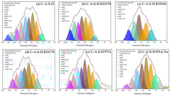 29Si NMR spectra for (a) C-A-S-H; (b) C-A-S-H/KH570; (c) C-A-S-H/KH570; (d) C-A-S-H/KH570; (e) C-A-S-H/PVA; (f) C-A-S-H/PAA-Na.