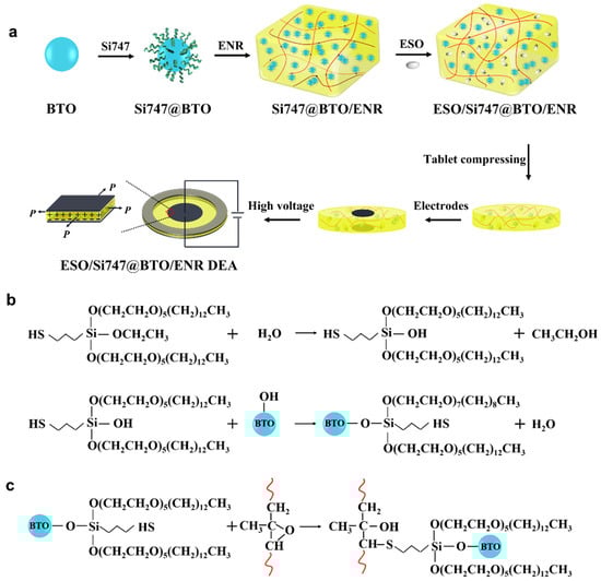 (a) Preparation and actuation mechanism of ESO/Si747@BTO/ENR DEA. (b) Reaction mechanism between Si747 and BTO nanoparticles. (c) Mechanism of Si747 reaction with ENR chains.