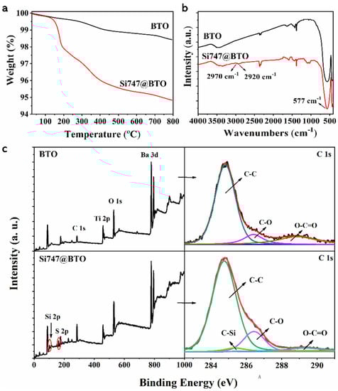 The TGA curves of pristine BTO and Si747@BTO nanoparticles are compared in Figure 2a. Further, the mass residues of pristine BTO and Si747@BTO nanoparticles at 800 °C were determined to be 98.43% and 94.83%, respectively. The lower residual masses of Si747@BTO, when compared to the pristine BTO nanoparticles, can be attributed to the grafting of Si747. The FTIR spectra of pristine BTO and Si747@BTO nanoparticles are displayed in Figure 2b. The two new characteristic peaks at 2970 cm−1 and 2920 cm−1 were attributed to the -CH2 and -CH3 stretching vibration of Si747, respectively. The XPS wide-scan spectra, as well as the C1s spectra of BTO nanoparticles and Si747@BTO nanoparticles, are provided in Figure 2c. Compared to pristine BTO, the new Si 2p and S 2p peaks in Si747@BTO nanoparticles were attributed to the presence of Si747 (Figure 2c). In addition, the intensity of the peak corresponding to the O-C=O bond in the C1s spectrum was weakened in Si747@BTO nanoparticles when compared to BTO nanoparticles. The areas under the peaks of the C-C and C-O bonds of Si747@BTO nanoparticles also enlarged when compared to those of pristine BTO due to the presence of large numbers of ether bonds in Si747. The presence of C-Si bonds in the C1s spectrum of Si747@BTO nanoparticles confirmed the existing sulfhydryl groups in Si747. Overall, Si747 was successfully grafted to the surface of BTO nanoparticles.