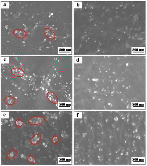 The SEM images of ENR composites, with various loadings of BTO and Si747@BTO nanoparticles, are provided in Figure 3. The red circle in SEM images represents the aggregation. Pristine BTO nanoparticles almost appeared to be exposed on the fracture surface of the ENR matrix (Figure 3a,c,e), indicating poor interfacial bonding between BTO nanoparticles and the ENR matrix. In addition, numerous BTO aggregations were appeared on the ENR matrix and increased with the content of BTO nanoparticles. However, the Si747@BTO nanoparticles were uniformly dispersed in the ENR matrix when compared to BTO/ENR composites (Figure 3b,d,f). Even after the increase in the content of Si747@BTO nanoparticles to 30 phr, small amounts of aggregations were found in the ENR matrix. In addition, the interface between Si747@BTO nanoparticles and the ENR matrix became more ambiguous than that of BTO/ENR composites. This might be due to the formation of strong covalent bonds between Si747 and ENR chains during the vulcanization process, thereby improving the dispersion and interfacial compatibility of polymeric composites [24].