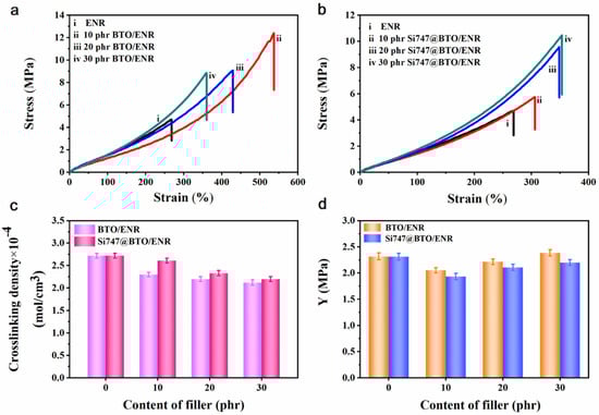 Typical stress–strain curves of ENR composites. (a) BTO/ENR and (b) Si747@BTO/ENR composites. (c) Crosslinking density, and (d) Y values of BTO/ENR and Si747@BTO/ENR composites.