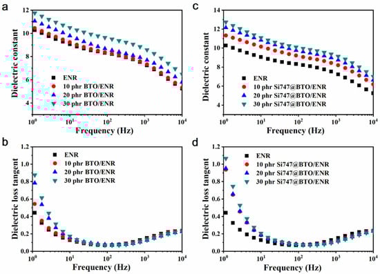 The changes in εr and tanδ of BTO/ENR and Si747@BTO/ENR composites as a function of frequency are shown in Figure 5. The εr of ENR composites decreased as the frequency increased due to the dipolar polarization of ENR chains (Figure 5a,c), as well as the interface polarization between the dielectric filler and the ENR matrix, which cannot keep up with the change in the electric field [36,37]. In addition, more doped BTO nanoparticles resulted in higher εr values in the ENR composites. This can be attributed to BTO nanoparticles with higher εr than that of the ENR matrix, leading to ENR composites with elevated εr. Additionally, the introduction of interfacial polarization between the ENR matrix and the BTO nanoparticles enhanced the εr of ENR composites. Moreover, the εr of Si747@BTO/ENR composites was larger than that of BTO/ENR composites at the same filler content. For example, the 30 phr Si747@BTO/ENR composite showed an εr of 10.06 at 100 Hz, a value higher than that of the 30 phr BTO/ENR composite (9.5 at 100 Hz). The increased εr would be ascribed to the presence of Si747, which effectively enhanced the dispersion of BTO nanoparticles in the ENR matrix, resulting in stronger interfacial polarization [9,38]. The interface polarization not only increased the εr, but also enhanced the tanδ of the ENR composites (Figure 5b,d) [39]. At a certain frequency, the Si747@BTO/ENR composites exhibited higher tanδ than that of the BTO/ENR composites, at the same filler content. However, the largest tanδ of the Si747@BTO/ENR composites was still less than 0.2 at 10 Hz, meaning that the electrostatic energy could efficiently be converted into mechanical energy [40].