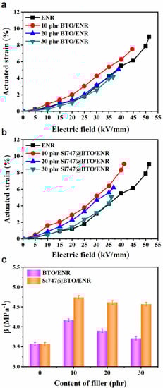 The changes in actuated strains of ENR composites with various loadings of BTO and Si747@BTO nanoparticles, as a function of the electric field, are displayed in Figure 6a,b, respectively. Under a certain electric field, BTO/ENR and Si747@BTO/ENR composites both showed the largest electrically actuated strains in the 10 phr filler. This can be interpreted by the lowest Y and increased εr leading to the largest β (Figure 6c). In regard to nanoparticles from 20 phr and 30 phr, the actuated strains of ENR composites declined. However, the Si747@BTO/ENR composites displayed larger actuated strains than BTO/ENR composites at the same filler loading and electrical field. For example, the 10 phr BTO/ENR composite displayed an actuated strain of 6.27% at 40 kV/mm, while the 10 phr Si747@BTO/ENR composite showed an actuated strain of 8.34% within the same electric field. The improved actuated strains resulted from the larger β of Si747@BTO/ENR composites.