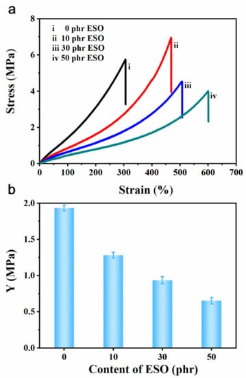 (a) Stress–strain curves of Si747@BTO/ENR composites with various loadings of ESO: (i) 0 phr, (ii) 10 phr, (iii) 30 phr, and (iv) 50 phr. (b) Y of 10 phr Si747@BTO/ENR composites with various loadings of ESO.