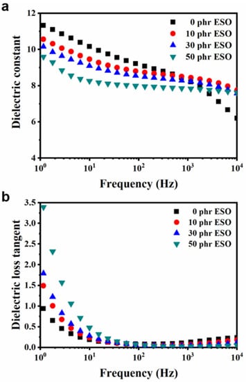 The dielectric behaviors of Si747@BTO/ENR composites with various loadings of ESO are displayed in Figure 9. The εr decreased with the increase in content of ESO (Figure 9a), due to the lower εr of ESO (7.8 at 1 kHz) than that of the 10 phr Si747@BTO/ENR composites (8.3 at 1 kHz). The decreased effective volume concentration of Si747@BTO nanoparticles in the ENR matrix also weakened the interfacial polarization. Meanwhile, εr declined as frequency rose, due to the polarization of the ENR composites that cannot keep pace with the change in frequency [44]. As shown in Figure 9b, the ESO increased the tanδ of Si747@BTO/ENR composites even though it decreased the εr of the ENR composites. The increased tanδ may be attributed to the liquid characteristics of ESO [45]. However, the largest tanδ was lower than 0.47 at 10 Hz, meaning that small amounts of energy were lost via dielectric loss during actuation.