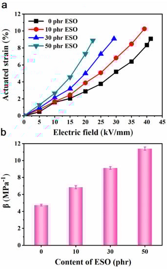The actuated strains of Si747@BTO/ENR composites, which are filled with different contents of ESO, are illustrated in Figure 10a. The actuated strains of the ESO/Si747@BTO/ENR composites increased sharply as a function of ESO content. The Si747@BTO/ENR composite filled with 50 phr ESO showed a maximum actuated strain of 8.89% at 22 kV/mm. This value was about 5.1-fold higher than that of pure ENR (1.45%) under the same electric field. Some similar works were compared in Table 1, where ESO/Si747@BTO/ENR composites displayed a relatively enhanced actuated strain. The enhanced actuated strain was ascribed to ESO, which not only destroyed the filler network in the ENR composite, but also weakened the molecular chain entanglement, thereby leading to lower Y and improved β (Figure 10b). In Figure 10b, the β increased to 11.4 MPa−1, while that of pure ENR was only 3.5 MPa−1. Furthermore, the dielectric strength of ESO/Si747@BTO/ENR composites declined with ESO content due to the increment in the formed defects by ESO [46]. However, the dielectric strengths of all ESO/Si747@BTO/ENR composites were larger than 22 kV/mm, thereby judging a relatively safe electrical field.