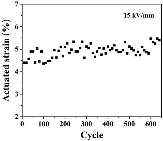 The history dependence of 50 phr ESO/Si747@BTO/ENR DEA under a cyclic electric field of 15 kV/mm is provided in Figure 11. The maximum cycle for the 50 phr ESO/Si747@BTO/ENR composite reached 640. In addition, the 50 phr ESO/Si747@BTO/ENR DEA displayed relatively stable actuated strain with a little increment during cycling. The slightly increased actuated strain might be ascribed to the creep processes of ENR chains [47].
