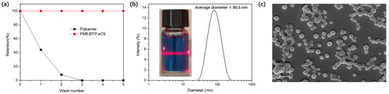 Figure 2a shows the retention of poloxamer in the ssNP system during the surfactant−stripping process. The filtrate obtained after each centrifugal washing step was collected to evaluate the quantity of residual poloxamer via a colorimetry assay (as described in the experimental process). The retention values were obtained from the absorption of cobalt thiocyanate–poloxamer complexes from each filtrate in Figure S2. It is obvious that a fivefold stripping process eliminated most excess poloxamers, while the quantity of light−harvesting material was unchanged and did not lead to sedimentation. Figure 2b,c exhibit well−dispersed spherical ssNPs without aggregated clusters, even after the stripping of most surfactants. The size of the NPs determines the phase separation and intermixing of the donor and acceptor in the NP films. It was reported in our previous work that, by precisely controlling the size of the pristine NPs in the nm regime, it is possible to generate thin films with optimized domain sizes [16]. An average diameter of 90 nm was suitable for the deposition of an active layer film with a thickness of approximately 100 nm. This is due to the deformation of the organic semiconductor NPs during spin−coating and the drying process [15]. As shown in Figure S3, thermal annealing−evolved ssNP films on the ZnO surface formed a discrete structure with isolated spheres to an interconnected one with an ambiguous surface, which is beneficial for charge transport through the percolated NP film [34].