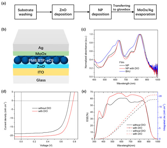 (a) Flowchart of PM6:BTP−eC9 ssNP solar cell fabrication; (b) device architecture of the PM6:BTP−eC9 ssNP solar cell; (c) normalized UV−vis absorption spectra of PM6:BTP−eC9 ssNP and chloroform solution−processed films; (d) J−V characteristics; and (e) EQE of PM6:BTP−eC9 ssNP processed solar cells with or without DIO.