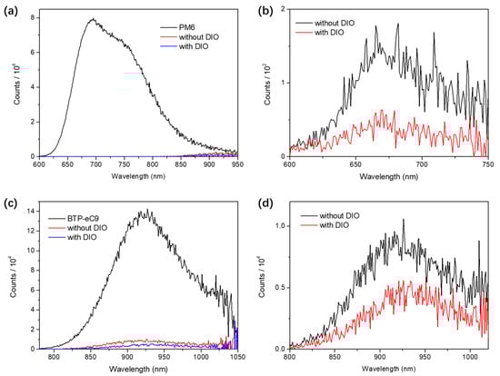 PL spectra of neat PM6, neat BTP−eC9, and ssNP films under excitation of (a,b) 560 nm and (c,d) 750 nm, respectively.