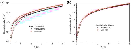 The charge−carrier mobilities of PM6:BTP−eC9−based ssNP solar cells were tested using the SCLC model through fabrication of a hole−only and electron−only device with ssNPs (see experimental process). As shown in Figure 6a, the DIO−free device exhibited a relatively low hole mobility of 8.88 × 10−5 cm2 V−1 s−1, as compared to that of the device with DIO (1.54 × 10−4 cm2 V−1 s−1), which has almost twofold the magnitude of the DIO−free device. Nevertheless, the values of the electron mobility in these two types of devices are much closer, which exhibits a μe of 1.32 × 10−4 cm2 V−1 s−1 and 1.41 × 10−4 cm2 V−1 s−1 for solar cells without and with DIO, respectively. It is suggested that the imbalanced μh and μe mobilities limit the charge extraction in DIO−free devices and results in restrained JSC and FF with severe bimolecular recombination (Table 1) [16]. The SCLC results further reveal that the performance loss in the DIO−free device is partially caused by inefficient and imbalanced charge transport.