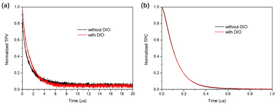 To further probe the charge transport and collection behaviors in ssNP solar cells, the TPV and TPC were measured to evaluate the impact of DIO on the charge carrier lifetime (τ) and sweeping out time (tS) of the devices [42,43]. As shown in Figure 7, the devices with DIO exhibits a longer τ value of 1.43 μs and shorten tS value of 0.118 μs in comparison with those of DIO−free device (τ = 1.24 μs and tS = 0.119 μs). The prolonged lifetime of the carriers and the accelerated charge collection would lead to enhancements of JSC and FF values in in solar cells with DIO as depicted above.