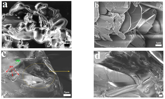 FE-SEM images of (a) PF, (b) BN-OH, and (c,d) PF/BNs.