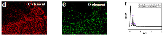 Figure 1 exhibits the FE-SEM images of PF, BN-OH, and PF/BNs. The surface of the phenolic is relatively smooth (see Figure 1a) [13]. Gel permeation chromatography (Agilent1260HTGPC) and nuclear magnetic resonance spectrometry (JNM-ECZ400S) revealed that the average molecular weight (Mn) is about 514, with the functional groups Ph, -CH2-O-CH2-, and Ph-CH2-Ph, respectively (see Figure S1a,b). Figure 1b shows the BN sheets after ultrasonic treatment; the thickness of the BN sheets is less than 100 nm. It is obvious that the BN-OH edges are revealed and folded, and a lamellar structure is observed. Figure 1c,d show that BN-OH nanosheets are inlaid into the phenolic matrix. The excellent compatibility between PF and BN is possibly attributable to the exfoliation and hydroxylation of BN sheets.