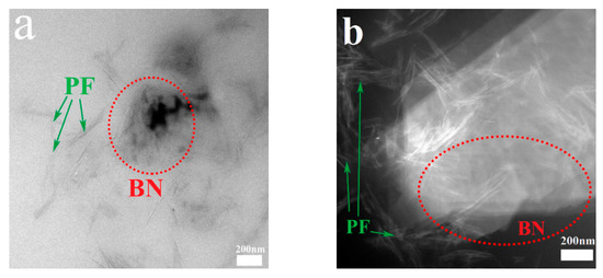 The TEM images of PF/BNs show that PF and multi-layer BN sheets are cohesively composited (see Figure 3), and the thickness of the BN sheets is less than 100 nm. The floccules in PF might be the grains in PF.