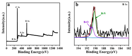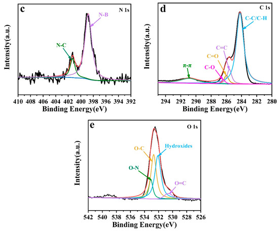 The XPS spectra of the PF/BN samples are shown in Figure 5. The spectra of B1s and N1s reveal that the peaks at 190.0 and 398.8 eV can be assigned to B-N bonds (Figure 5b,c) [22]. The binding energy at about 192.5 eV might be attributed to B-O bonds. For the N 1s spectrum, the peak at 401.3 eV can be attributed to C-N bonds [23]. The high-resolution C1s curve of PF/BNs in Figure 5d can be deconvoluted into four peaks at 284.2, 285.7, 286.2, and 291.0 eV, corresponding to C-C, C=C, C-O, and π-π chemical bonds, respectively [24,25]. The O 1s curve of PF/BNs in Figure 5e can be deconvoluted into four peaks at 530.6, 532.0, 532.7, and 533.1 eV, corresponding to -OH, C=O, C-O, and N-O bonds, respectively [15]. The above information proves that PF/BNs were successfully prepared, and BN was hydroxylated.