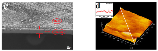 Figure 6 shows the SEM and AFM analyses of pure PF and PF/BNC coatings. Comparing the images of the PF coating, there are some bright features on the surfaces of PF/BNCs, which are attributable to BN particles (Figure 6a,b). The thickness of the PF/BNCs is about 30 μm (Figure 6c), and the roughness of the PF/BNCs is about 1.597 nm (see Figure 6d).