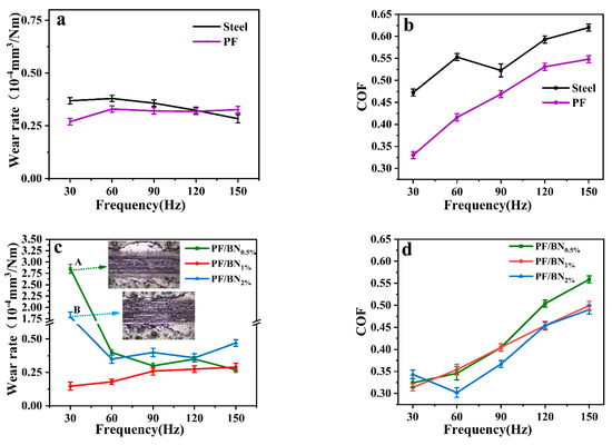 Wear-rate–frequency curves (a) and COF–frequency curves (b) of steel discs before and after being coated with PF. Wear-rate–frequency curves (c) and COF–frequency curves (d) of PF/BNCs sliding against steel balls.
