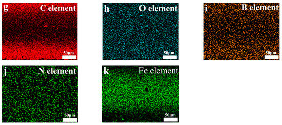Figure 8 shows the SEM images and mapping images of the worn surfaces of steel, PF coatings, and PF/BN1.0% coatings sliding against steel balls at 90 Hz. The steel discs are badly worn with deep furrows and many abrasions, which indicate that serious abrasive wear occurred during sliding. The worn surface of the PF-coated sample displays much smoother wear than that of pure steel blocks [9]. Furthermore, the PF/BNCs show even less wear than the PF coatings, which is consistent with the wear rate and COF values (see Figure 7) [26]. The EDS mappings of the worn surfaces of PF/BNCs (Figure 8f) show that B, N, O, C, and Fe elements exist on the worn surfaces (Figure 8g–k), from which it can be deduced that the coating of the tribo-films containing the above elements improves the tribological properties [15].