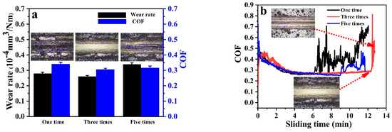 To investigate the tribological properties of PF/BNCs with different thicknesses, the wear rates and COFs of PF/BNs1.0% coated 1 time, 3 times, and 5 times were investigated. The PF/BNCs coated 3 times possess a lower wear rate and COF than those coated 1 and 5 times. The optical images of the worn surfaces show that the worn surfaces of the films coated 3 times are much smoother than those of the other samples, which is inconsistent with the wear rates and COFs (see Figure 9a). The COF changes during sliding for composite films with different thicknesses are shown in Figure 9b. The curves violently fluctuate after the process is stable for a few minutes. The optical images of the worn surfaces show that the direct increase in COF indicates the destruction of the coatings. The films coated 3 times have a longer period of stable COFs.