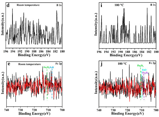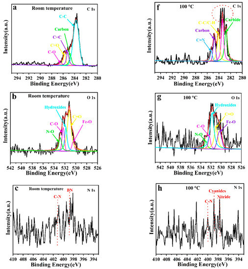 Many investigations have been conducted to improve the friction and wear mechanisms of phenolic resin and its composites. Zhang et al. found that a PF–graphene composite coating exhibited enhanced tribological properties under all tested conditions, which could be attributed to the increased interfacial interaction between graphene and phenolic resin [20]. It is interesting to find tribological mechanisms from other possible aspects. To determine the anti-wear and friction-reducing mechanisms of the PF/BNCs, the XPS spectra (elements C, O, B, N, Fe) of the wear scratches of PF/BNCs before and after heat treatment at 100 °C were investigated (see Figure 11). The high-resolution C1s spectrum of the worn surfaces of PF/BNCs is divided into the peaks of C-C (283.7 eV), carbon (284.7 eV), C=C (285.2 eV), C-O (286.4 eV), and C=O (285.7 eV) [27]. On the other hand, the high-resolution C1s spectrum of the worn surfaces of PF/BNCs heat-treated at 100 °C is divided into the peaks of C=N (285.2 eV), carbon (284.8 eV), C-C/C-H (284.1 eV), carbide (282.8 eV), and other groups (283.4 eV). The above analysis potentially proves that the C element on the worn surfaces of the coatings after heat treatment is transferred from C-O/C=O and C-C to C=N, carbide, and other chemical bonds, which is possibly attributed to the cross-linking of the PF prepolymers (see Figure 11a,f) [12]. Comparing the O1s curves before and after heat treatment, it is observed that the curves from the worn surfaces after heat treatment are noisier than before heat treatment, possibly due to the decreased oxygen contents after heat treatment (see Figure 11b,f). The peaks at about 530.3, 531.0, 531.8, 532.3, and 533.0 eV are attributed to the chemical bonds of Fe-O, C=O, -OH, C-O, and N-O, respectively [15]. The decreased peak areas of N-O and C-O after heat treatment might be because of the cross-linking of prepolymers and the loss of H2O and other micromolecules at the same time [28,29]. The weak peaks of N1s of the worn surfaces are identified as C-N and B-N at 401.3 and 398.7 eV, respectively (see Figure 11c). After heat treatment, the B-N bonds are divided into nitride and cyanides, respectively [30]. The peak of B1s is too weak to be observed due to its low concentration. The peaks of Fe2p are also very weak, which might be attributed to the existence of PF/BN tribo-films. Furthermore, weak Fe-O bonds are found on the worn surface. It can be concluded that tribo-films containing C, O, N, and Fe are formed on the worn surfaces of the PF/BNCs, which can effectively protect the steel from damage [12]. Comparing the TGA analyses of PF/BN, it can be concluded that the cross-linking of the prepolymers occurs during heat treatment, and carbon and nitrogen are transferred to C=N bonds, carbides, nitride, and cyanides at the same time, which improves the tribological properties of these coatings.