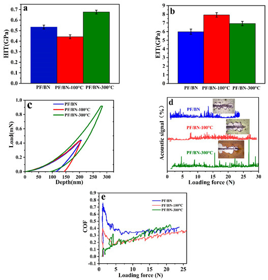 HIT (a), load–depth (b), ETT (c), COF–loading-force (d), acoustic signal–loading-force (e) curves of the PF/BNCs with and without heat treatment.