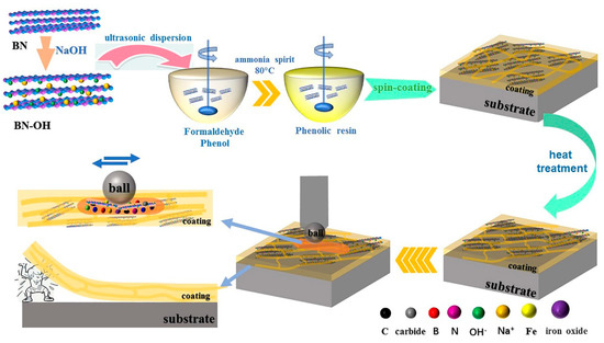 Firstly, h-BN (5.0 g) was transferred to a NaOH solution (concentration: 5 mol/L; volume: 100 mL) with agitation for 30 min and then ultrasonicated to obtain the exfoliated hydroxyl BN powders (BN-OH). Different contents of BN-OH (0.025, 0.05, and 0.1 g) were added to the mixture of formaldehyde (3 mL) and phenol (2 mL) with vigorous agitation at 80 °C. Furthermore, 0.5 g of NH3·H2O was dropped into the solution to provide an alkaline environment while vigorously stirring for 40 min to obtain the target products (named PF/BNs0.5%, PF/BNs1.0%, and PF/BNs2.0%, respectively). Next, the reactant was spun onto polished 316L steel surfaces at a rotation speed of 1200 rpm for 12 s. The coatings were obtained after being spun three times. The final product was treated in an incubator at 80 °C for 30 min. Finally, steel blocks coated with PF/BNs were heat-treated in a tubular furnace at 100 or 300 °C.