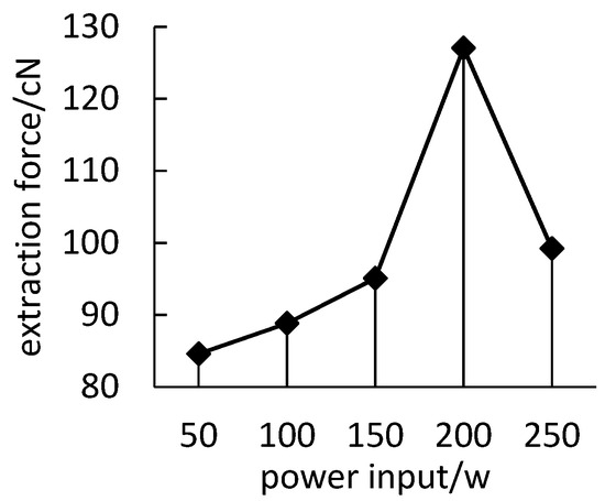 There is still an obvious gap among the selected superior processes shown in Table 3. F value represents the significant degree of the influence of factors on the index. The larger F is, the more significant the influence of factors on the index is. In addition, p-value is an index to measure the difference. A p-value less than 0.05 indicates that factors have a significant impact on the index. The F and p-values of the extraction force and strain are analyzed, respectively. For the extraction force, the Model F-value of 3.3 implies that there is a 6.47% chance that an F-value could occur due to noise. p-values lower than 0.0500 indicate model terms are significant. In this case AB (Time-Power), A2 (Time2) are significant model terms. Values greater than 0.1000 indicate that the model terms are not significant. The results imply that the interaction between treatment time and power has the greatest effect on the extraction force. The effect of treatment time and power alone on the extraction force is not significant.