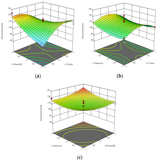 Response surface plot: Effect on extraction force of (a) power and time (b) gas and time (c) gas and power.