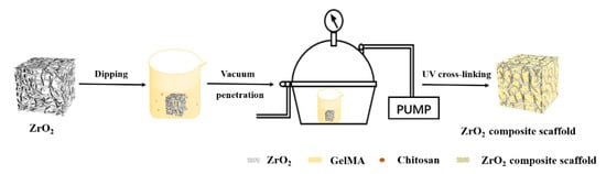2.2.5. Preparation of Porous Zirconia–Chitosan Particles–GelMA Hydrogel Composite Scaffolds