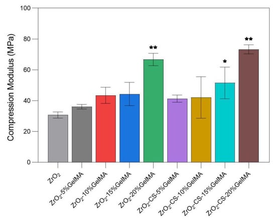 3.5. Mechanical Properties of Zirconia Composite Scaffolds