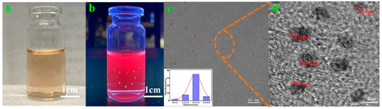 AuNCs: (a,b) appearance morphology of AuNC solution under visible light and UV lamp; (c,d) AuNC TEM (inset: AuNC diameter distribution) and HR-TEM image.