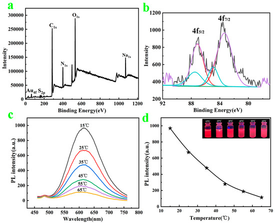 (a,b) XPS energy spectrum of AuNCs and Au4f of AuNCs; (c) AuNC fluorescence spectra at different temperatures; (d) different temperature peak-fluorescence intensities of AuNCs (inset is color change of AuNCs under UV lamp at different temperatures).