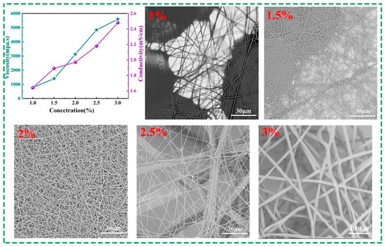 Spinning solution viscosity and conductivity at different concentrations, and the corresponding SEM images of nanofibers.