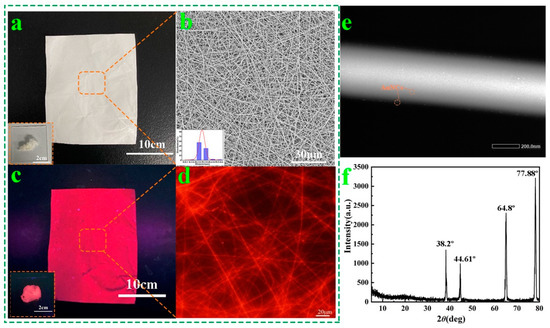 (a,c) AuNCs@PAM NFs under visible light and a UV lamp (the inset is a picture of AuNCs@PAM NFs being agglomerated); (b,d) SEM image (inset is the diameter distribution graph) and fluorescence microscopic image of AuNCs@PAM NFs; (e) STEM of AuNCs@PAM NF; (f) XRD pattern of AuNCs@PAM NFs.