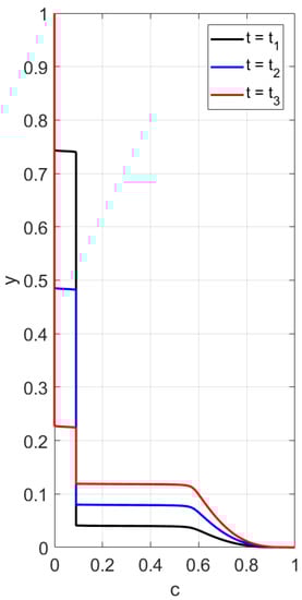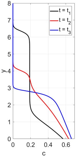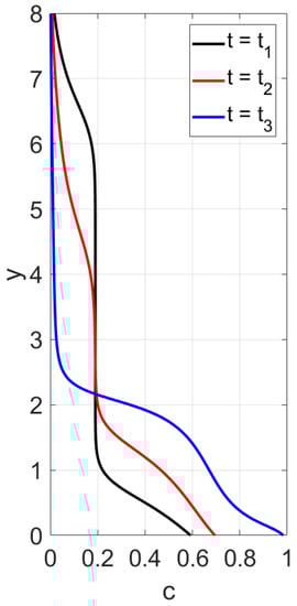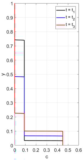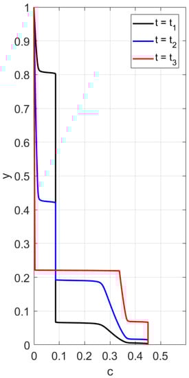 Figure 3. Calculated profiles of the concentration wave at different time instances for the shear thinning flux F s h ( c ) in the case when all the dissipation effects are negligible. The initial and boundary data are c 0 = 0.09 , c b o t = 1 , c t o p = 0 .