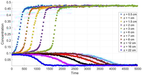 Figure 16. Calculated values of concentration versus time at different vertical locations for the flux F r z . Loss of monotonicity with the initial and boundary data c 0 = 0.19 , c b o t = 1 , c t o p = 0 .