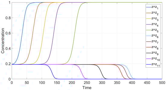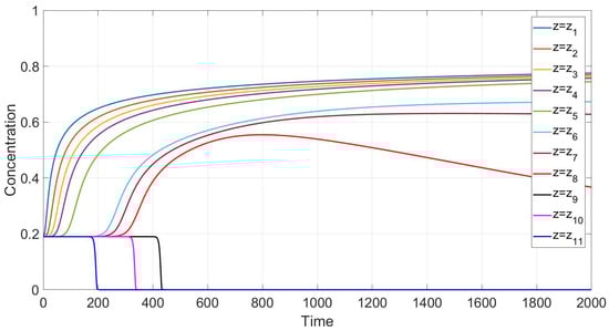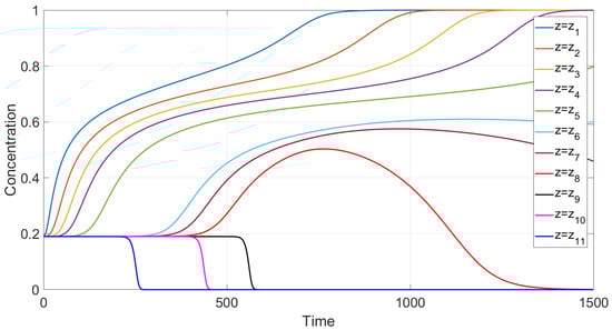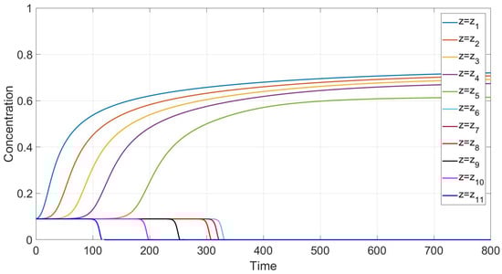 Figure 15. Calculated values of concentration versus time at different vertical locations for the flux F r z . There is monotonicity with the initial and boundary data c 0 = 0.09 , c b o t = 1 , c t o p = 0 .