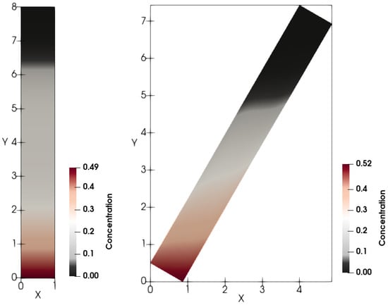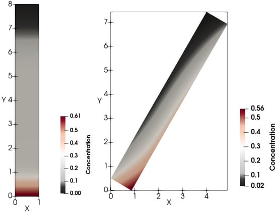 Figure 9. Calculated snapshots of concentration in the case of n = 0.34 for the flux B s h for both the vertical and tilted vessels. The inclination angle is 30°.