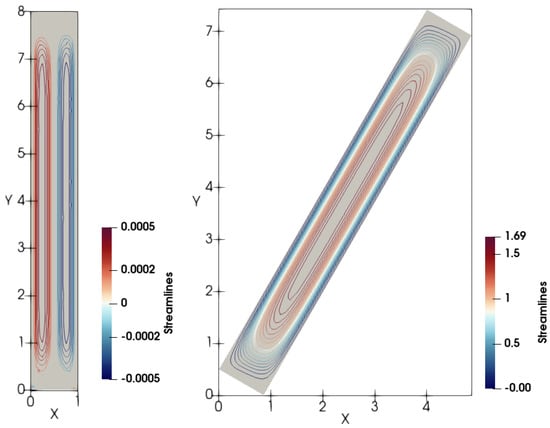 Figure 12. Streamlines of the mean volume velocity v for the vertical and inclined cells in the case of non-Newtonian fluid.