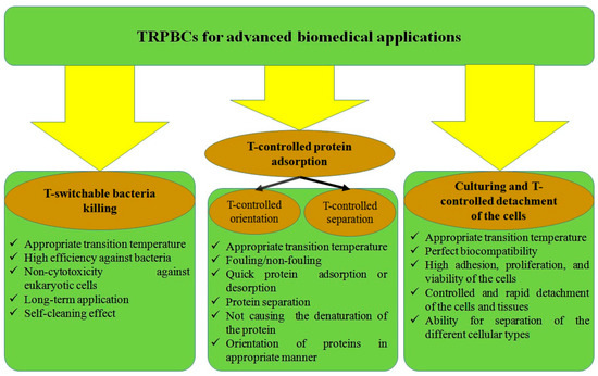 Cell adhesion and release, bacteria attachment, and protein adsorption are usually governed by nonspecific physical interactions with TRPBCs. Nonspecific physical interactions include van der Waals, electrostatic, steric, hydration, and hydrophobic forces. In some cases, specific biological active motifs can be inserted into TRPBCs, which essentially improves the efficiency of these systems. In the work [27], copolymer TRPBC, including N-isopropylacrylamide (NIPAM) as temperature responsive units and 2-lactobionamidoethyl methacrylate as specific biological active motifs, was synthesized. In turn, in the works [28,29], copolymer TRPBCs of poly(NIPAM)-block-poly(acrylic acid) and poly(2-(2-methoxyethoxy)ethyl methacrylate) with RGD motifs responsible for the acceleration of cell attachment were synthesized. Motivated by the strong progress in TRPBCs, in this paper we made an attempt to systematize the recent advances in the engineering of advanced biomedical TRPBCs. Additionally, the mechanisms of the temperature-induced transition of TRPBCs and methods of their fabrication and characterization were discussed in detail. Finally, three groups of advanced biomedical applications of the TRPBCs: temperature-stimulated bacteria killing, temperature-controlled proteins adsorption, as well as culturing and temperature-controlled detachment of the cells, were complexly described. The crucial requirements for TRPBCs suitable for advanced biomedical applications have been analyzed and listed.