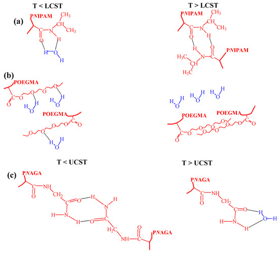 The simplified mechanisms of the LCST or UCST transitions for NIPAM (a), OEGMA (b) and NAGA (c) based TRPBCs.