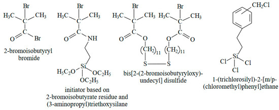 Five components are required for SI-ATRP [78,79,80]: initiator (multifunctional alkyl halide), metallic catalyst (containing the transition metal and halogen), ligand, solvent and monomer. Polymerization contains three steps: initiation, propagation, and termination. At the initiation step, the initiator generates the radical. The transition metal from metallic catalysis during the ATRP is oxidized from a lower to higher oxidation state and takes on the halogen that originally was the part of the initiator creating the radical. Once this radical is formed, it can initiate the growth of a polymer chain and polymerize the monomer, forming an active polymer chain. During the ATRP the growing chain transforms to the dormant state when the halogen of the metallic catalyst links to it. Once the transition metal takes on the halogen from the growing molecular chain, it transforms to the active state. Typical multifunctional initiators for SI-ATRP are presented in Figure 5.