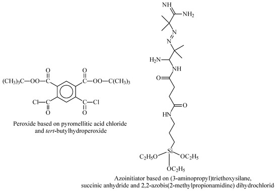 Another way of manufacturing TRPBCs involves non-controllable surface-initiated polymerization using multifunctional peroxide initiators or azo initiators [88,89,90,91]. Sometimes, the application of the coatings does not require high monodispersity of the brush, and non-controllable polymerization may be employed as well. The most common multifunctional initiators for SI-PP or SI-AP are presented in Figure 7.